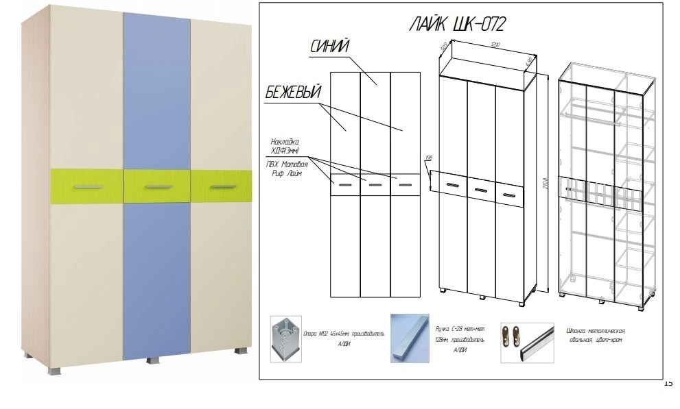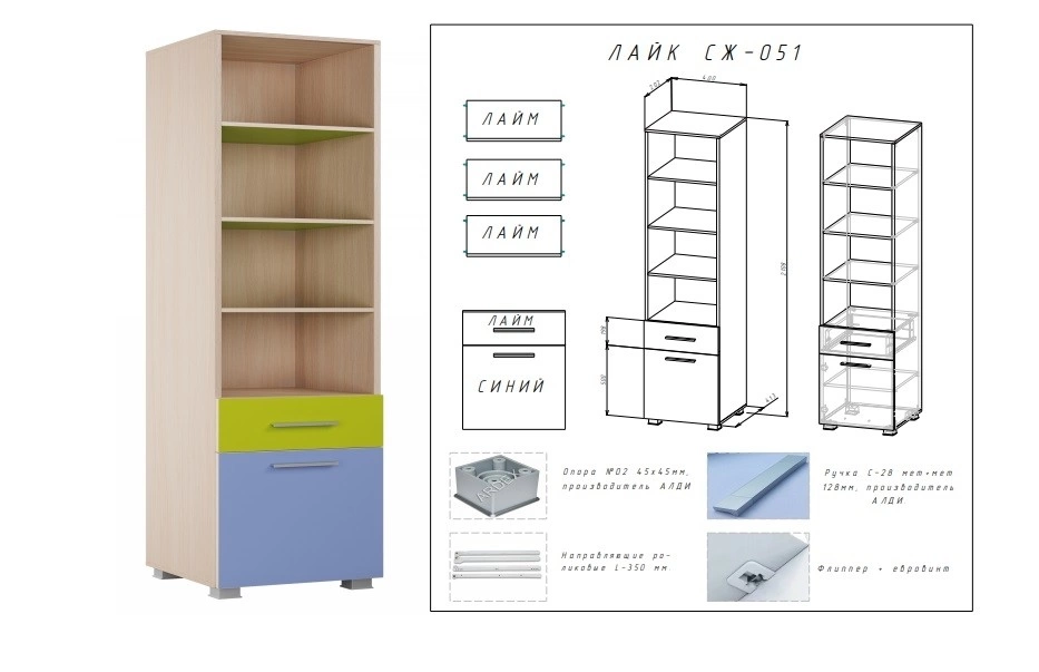 - Материал: ЛДСП 16мм/МДФ 10мм/Накладки на фасадах выполненные из ХДФ толщиной 3мм облицованного пленкой ПВХ Матовая Риф Лайм.