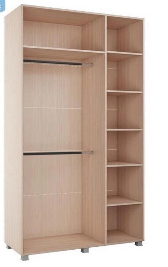 - Шкаф трёхстворчатый состоит из секции с полками (шириной 1/3 шкафа) и секцией с полкой и 2мя штангами (шириной 2/3 шкафа), данные секции универсальные, могут располагаться с любой стороны, для этого необходимо выбрать расположение отверстий под перегородку на верхней и нижней крышке.