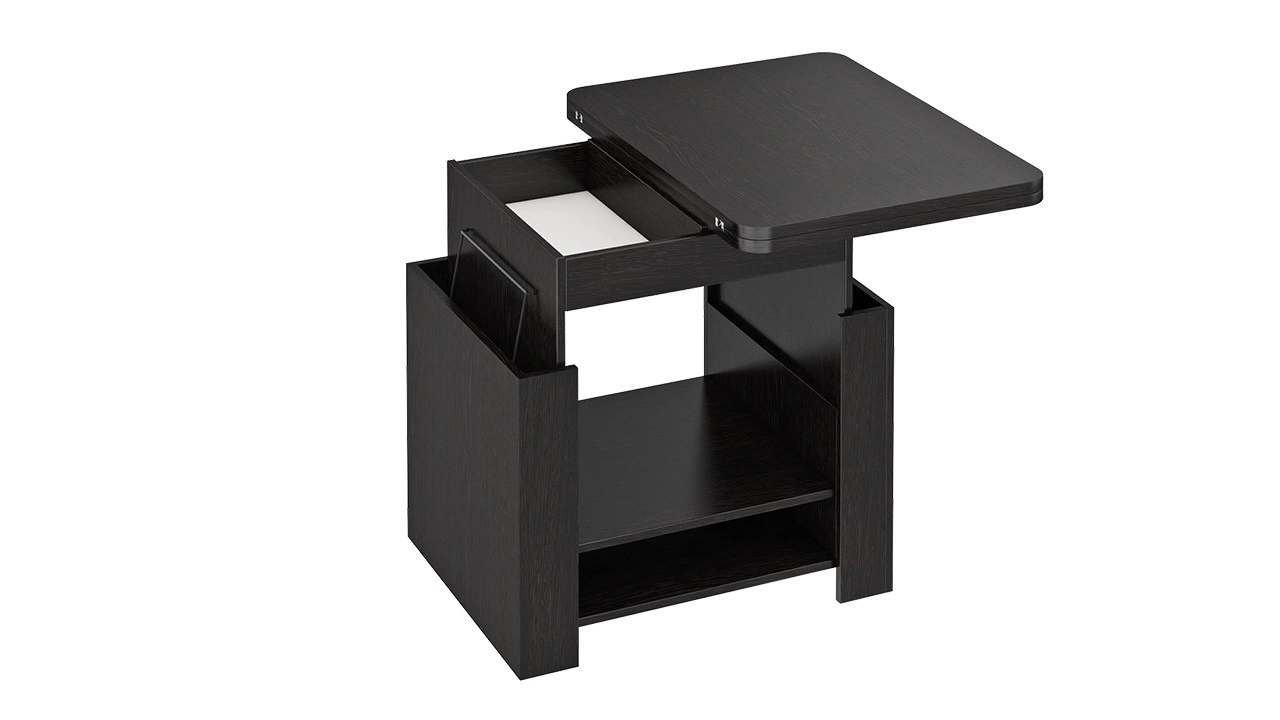 Компактная многофункциональная модель способна обеспечить удобство в самых разных ситуациях: журнальный стол-трансформер можно использовать по прямому назначению — для дополнения мягкого гарнитура, как письменный или компьютерный стол, а также в качестве тумбы для хранения различных вещей. Прочная конструкция трансформирующих механизмов и отличное качество материалов гарантируют долгий срок службы, а стильный дизайн — эстетичность интерьера комнаты. Длина стола в разложенном виде-1200 мм. Габаритная высота в разложенном виде - 750 мм.