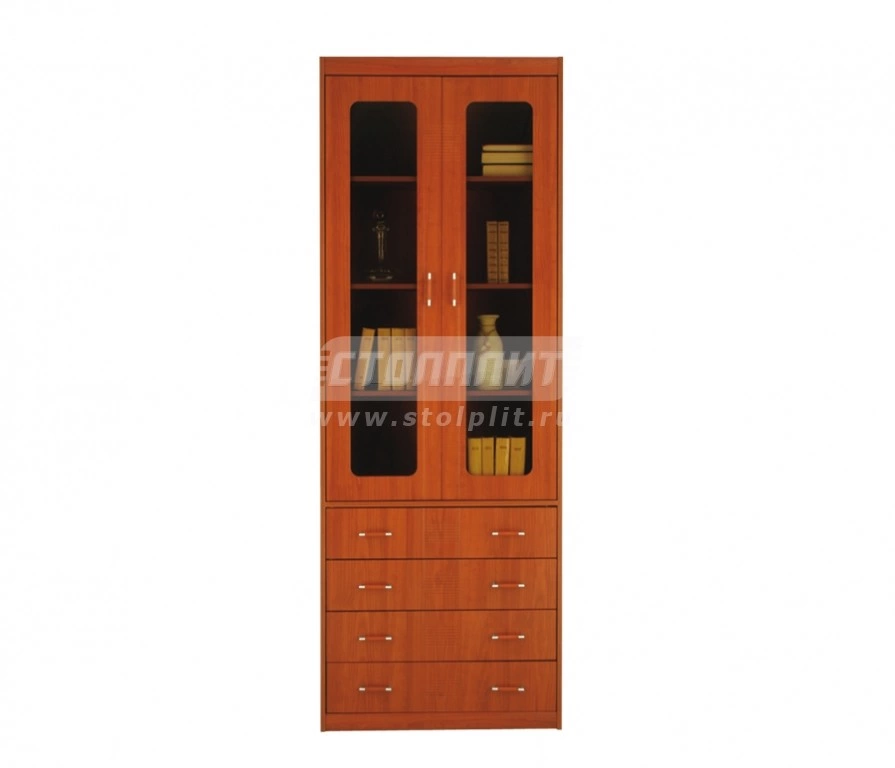 Шкаф с четырьмя ящиками и отделением со стеклянными дверцами. Это искусное сочетание классических форм и функциональности. В нижней части шкафа вы найдете четыре выдвижных ящика, а верхняя часть закрыта двумя дверцами со стеклянными вставками. В шкафу можно хранить книги, посуду или другие предметы. Цвет шкафа: «вишня Барселона» и «розовое дерево».