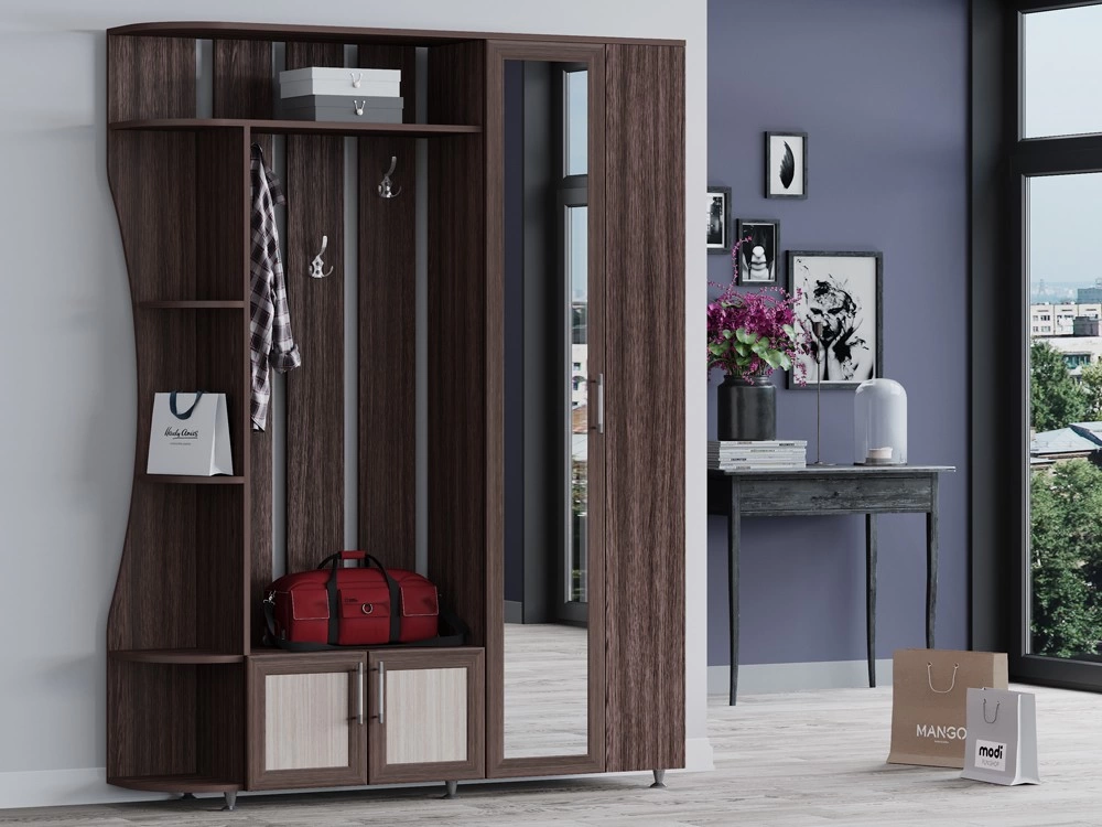 Модульная прихожая в коридор для малогабаритных квартир. Имеет компактные размеры и приятный дизайн. Зеркальная створка зрительно сделает шире узкую прихожую.