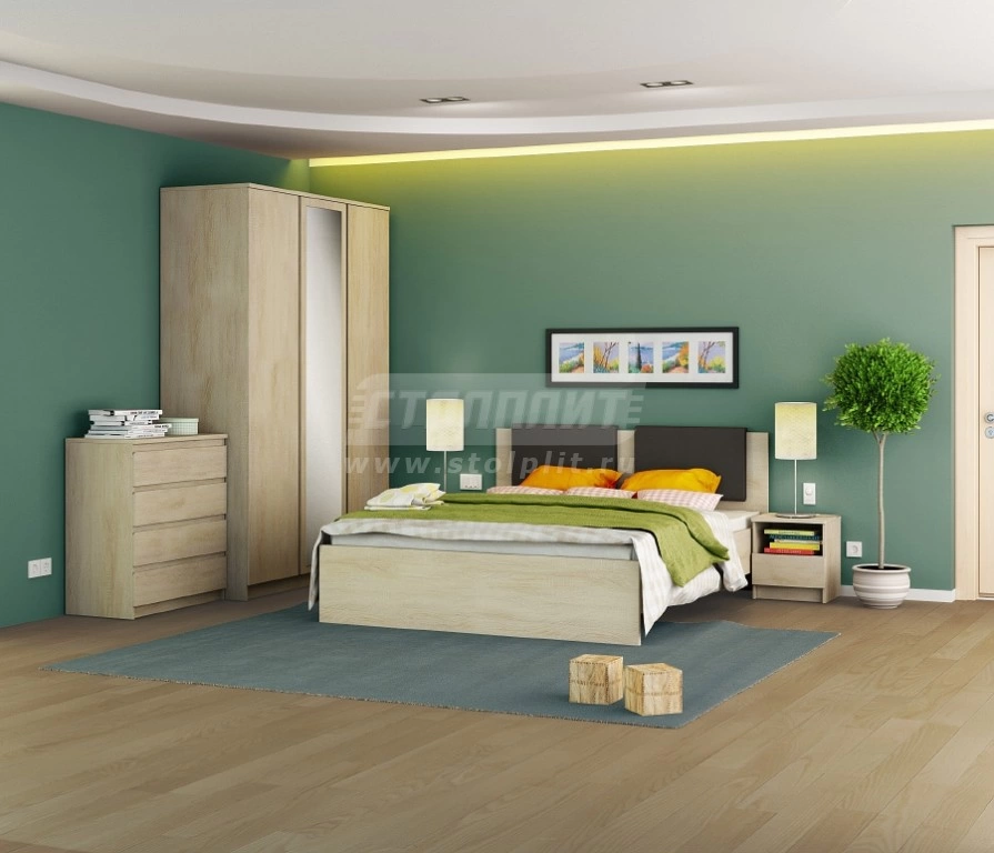 Набор мебели для спальни Веста украсит любую комнату. Размеры предметов мебели универсальны и подойдут для большого или среднего по размерам помещения. Спальня выполнена в цвете Дуб Сонома, который создает необходимую для отличного отдыха атмосферу гармонии и спокойствия. Её приятный дизайн будет каждый день дарить вам радостные эмоции. В набор мебели Веста входят: кровать, прикроватные тумбы, вместительный комод, трехстворчатый шкаф с зеркалом. Данный комплект включает в себя: