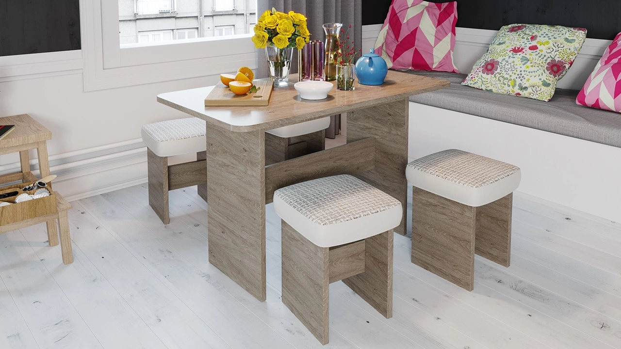 Для производства каркаса скамьи, стола и банкеток используется ЛДСП 22мм, что придает изделию дополнительную прочность. Обивка выполнена из износостойкой, устойчивой к пятнообразованию ткани и кожзама приятного светлого оттенка, которые имеют высокую степень непромокаемости, просты в